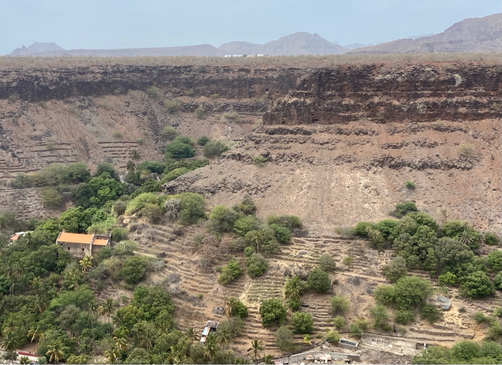 | | The Canyon of Cidade Velha is well irrigated and remains green all year long, unlike most of the country. The terracotta-roofed building to the left is a Franciscan Convent. |