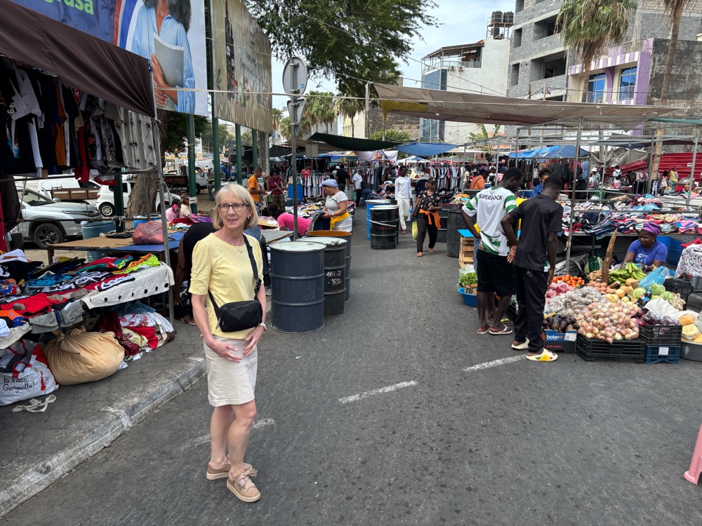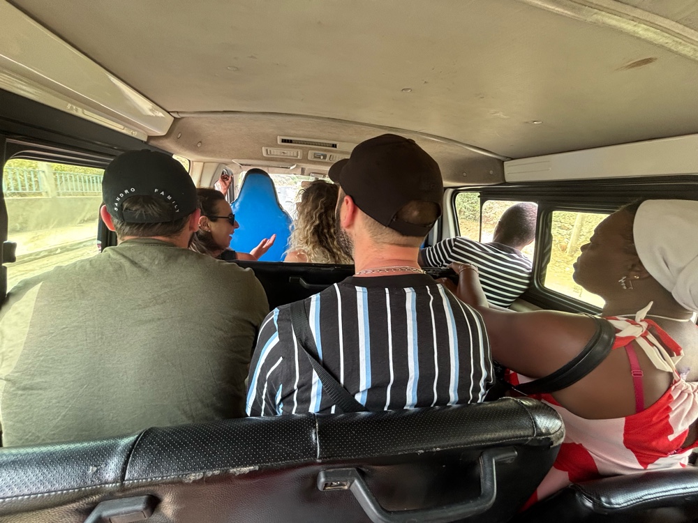 | | As we were finishing our walking tour of Praia and contemplating how to get to Cidade Velha, thirty minutes outside Praia, an aluguer (minivan) driver stopped and asked if we wanted to go there! It was crazily coincidental! We said, “Sure!” and jumped in. A taxi driver had earlier offered to take us for 50 Euros ($80 CAD), but this option got us there for $2.25 CAD each. An interesting experience, as we got to see how the average Joe gets around. These tiny vans seat up to 16 people (squeezed in) and 16 is exactly what the driver squeezed in. |