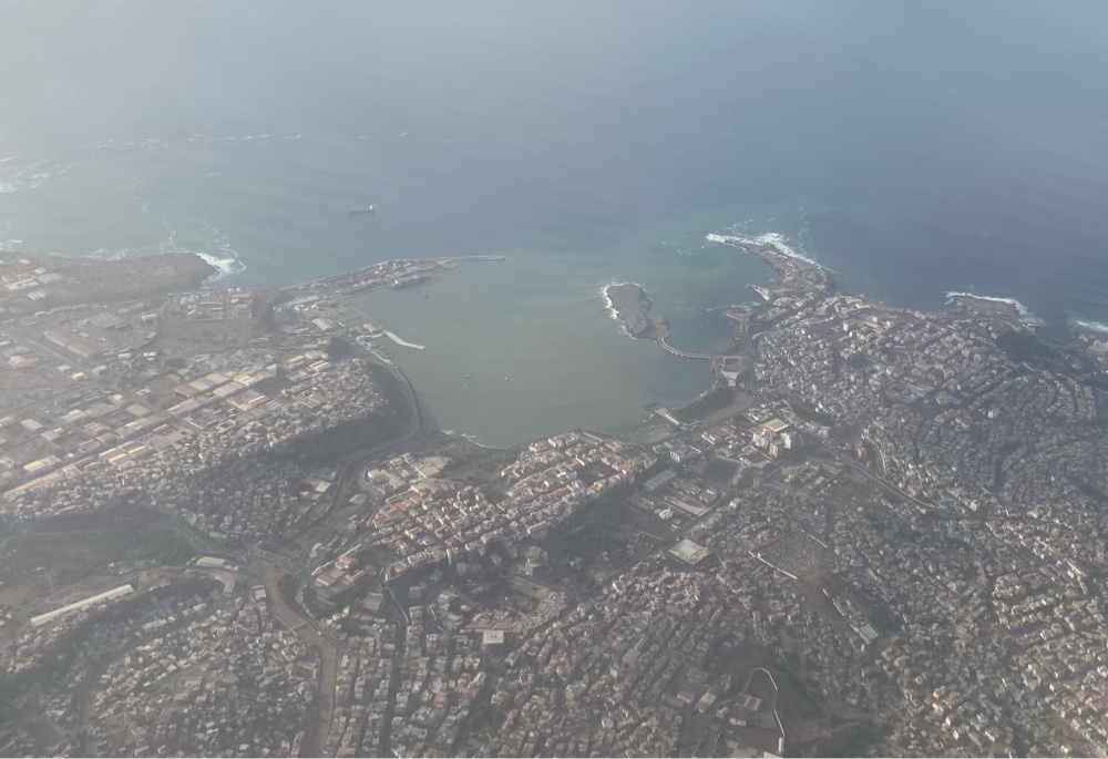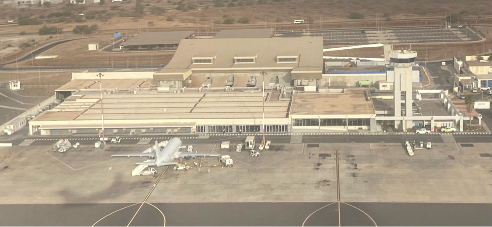 The view of Nelson Mandela International Airport in Praia upon takeoff. You can see our plane’s shadow on the tarmac.