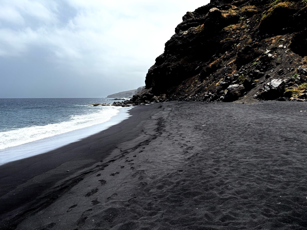 | | Halfway down the east coast, we stumbled across an exit on the road that led down the cliff to the most incredible black sand beach. The photo lighting doesn’t give an accurate sense of just how black the sand is. |