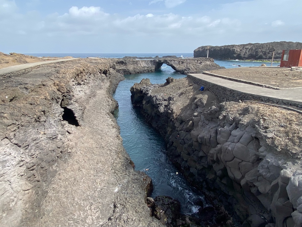 | | Just south of Sao Jorge, on the island’s west coast, is a ‘natural bridge’ (arch) and a ‘piscinas naturalis’ (natural swimming pool) called Ponta da Salinas. Almost every community in the Azores has a piscina naturalis, but here, they are few and far between. Basically, a calm inlet or cove is turned into a protected swimming area with man-made enhancements. |