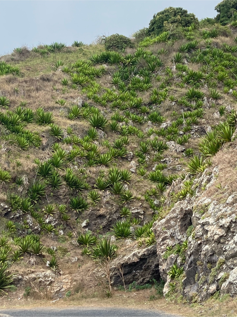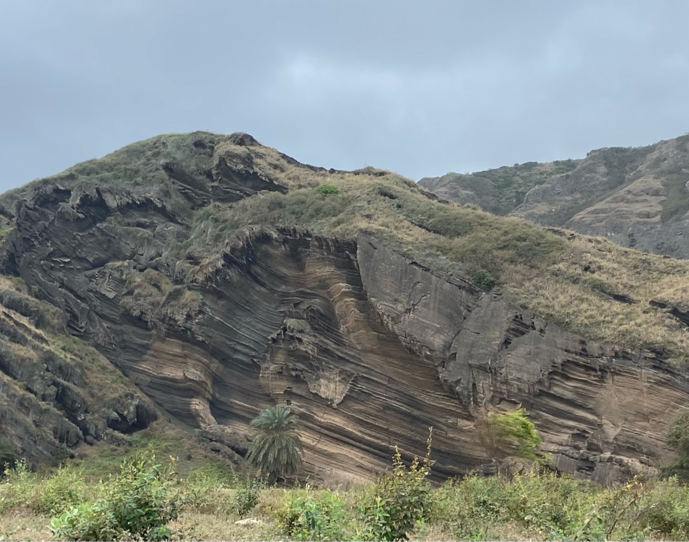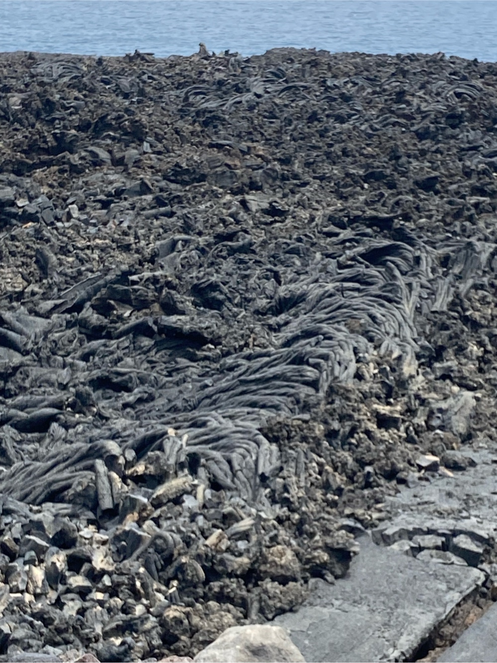 | | Along the east coast of Fogo, we saw this lava field. We assumed it was relatively ‘fresh’ lava rock, possibly from the eruption of 2014. However, it turns out, it was from one of the eruptions in the 1800s, which goes to show that it takes hundreds of years before vegetation can begin to form on lava rock. My geologist neighbour informed me that this is called pahoehoe lava (a Hawaiian word); he explained hat the top crust cools, but the low viscosity lava in the center twists and rolls the outer crust. |