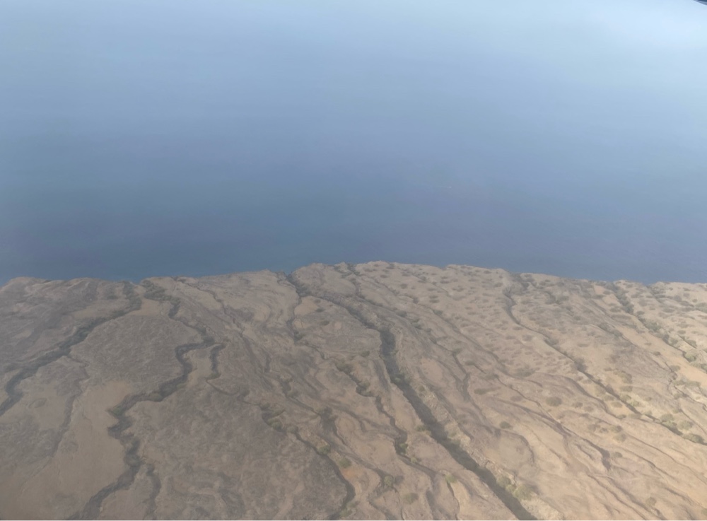 Our first view of Fogo. The volcano could only been seen from the other side of the plane, unfortunately. Our view was still useful, as it showed the lava trenches that pushed towards the sea from the volcano. Those trenches date back prior to recorded history.