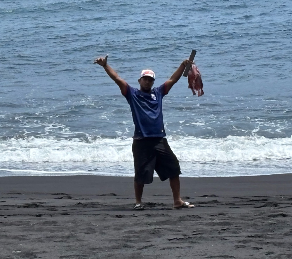 | | Fishermen had just come in with their catch and were sorting out their nets. One of them proudly showed us his string of red fish. |