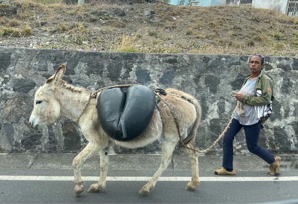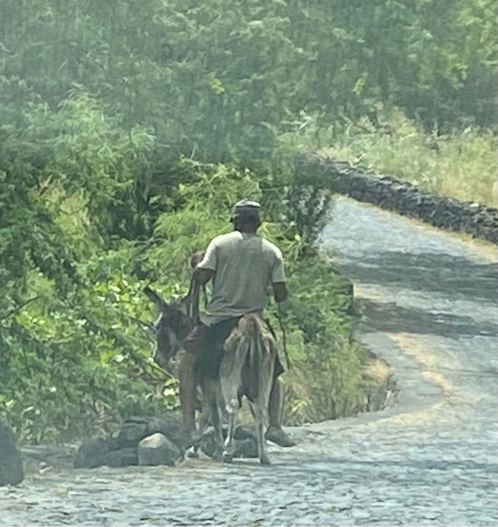 | | Donkeys are still popular in Cabo Verde for transporting goods. This was the first person we saw using one moving himself! |