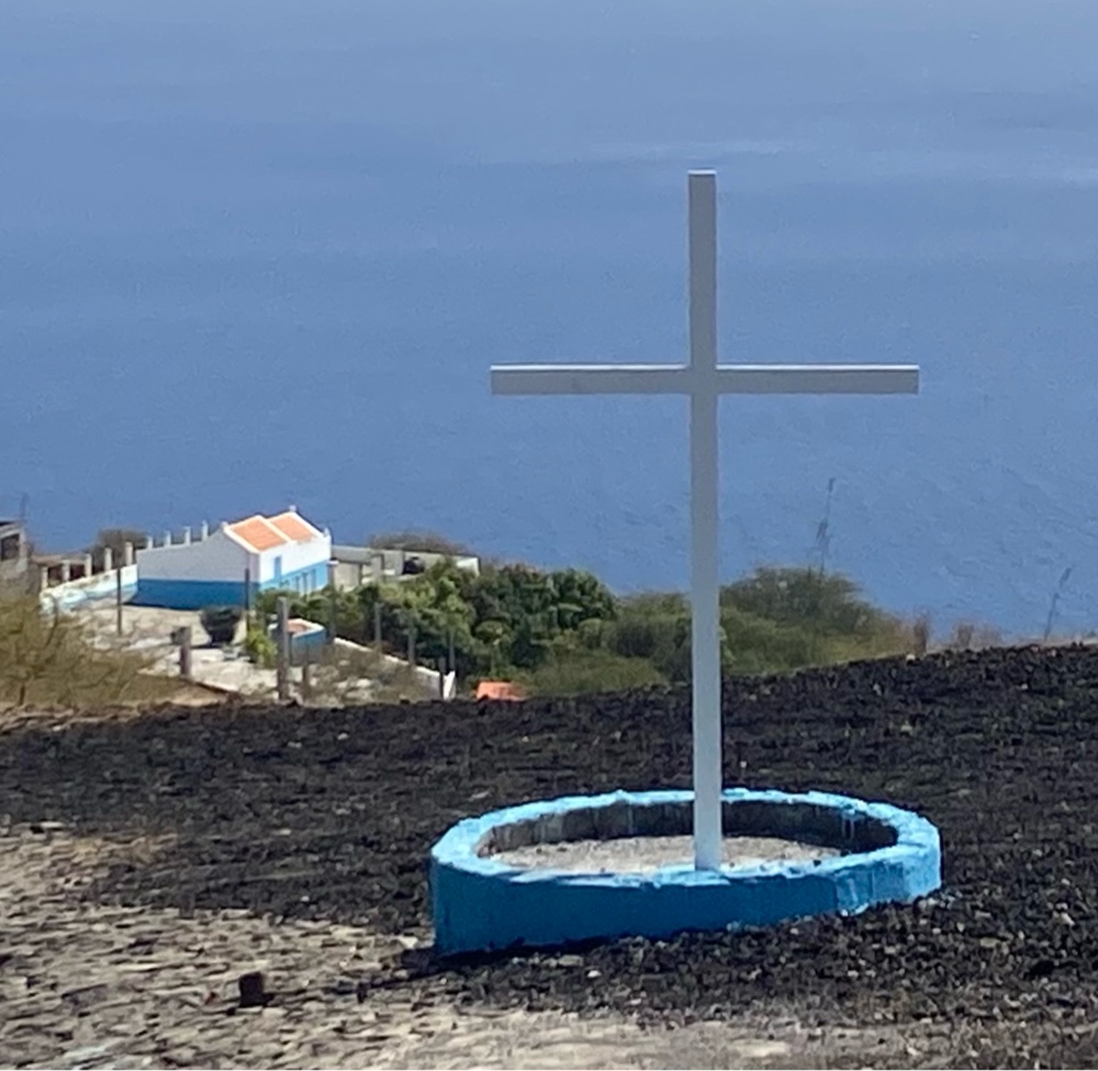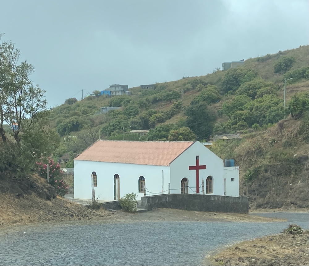 | | Apart from the volcano itself, Lonely Planet doesn’t list a lot of actual sights on Fogo. One of the sights it does list is the Chapel of Our Lady of Socorro, which was located down a 5km stretch of bumpy road near the end of our drive around the island. We felt it would be worth investigation! When we got there, however, we found the gate locked. That’s it to the left of the photo above. Apparently, the chapel was built to mark the miraculous statue of the Virgin Mary that was found by local shepherds. |