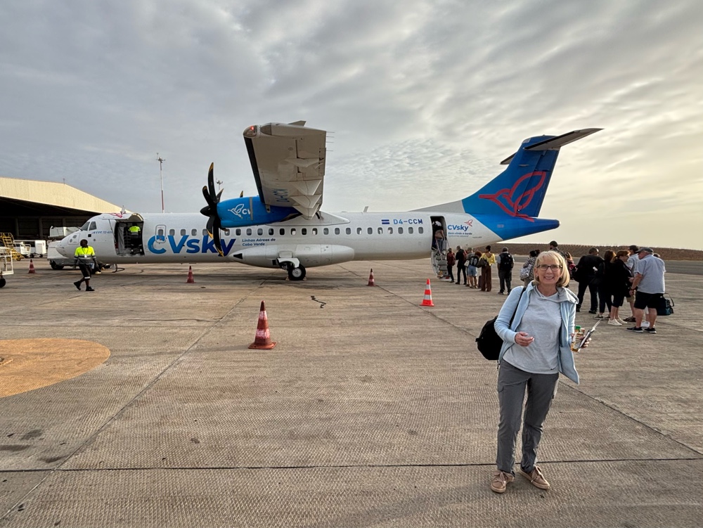 Boarding the packed Cabo Verde Airlines ATR-72-600 turboprop plane to Fogo. This is the aircraft type used to connect all the islands. You board from the rear, and the baggage compartment is just behind the cockpit.