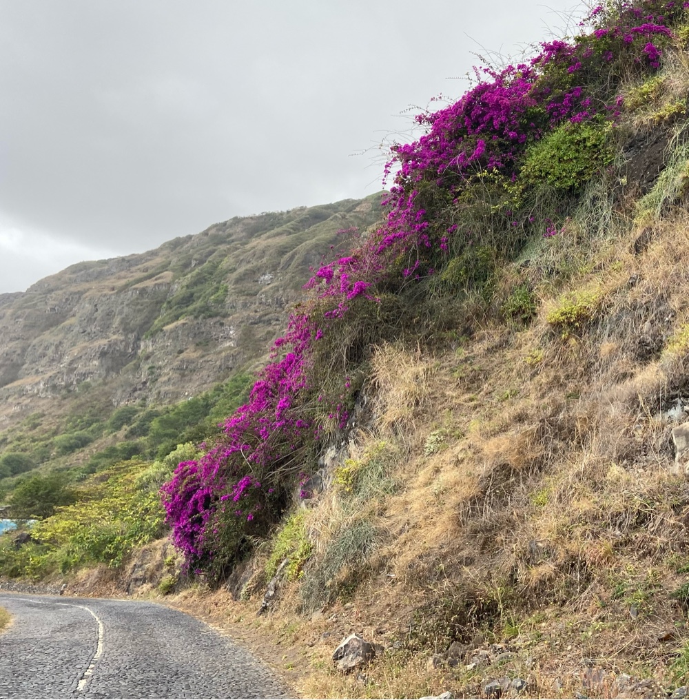 Bougainvillea spilling down over a cliff to the edge of the highway near Mosteiros.