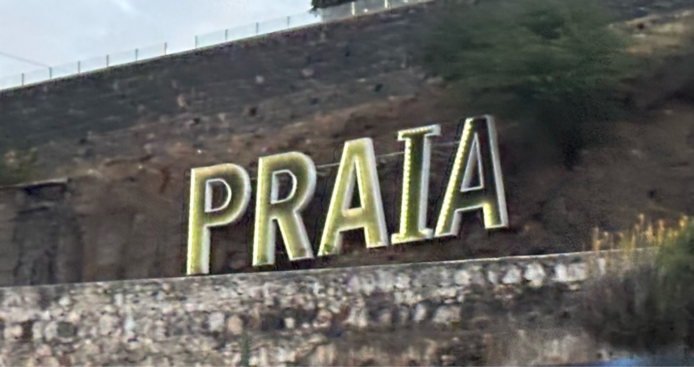 | Enroute to the airport, we passed the “PRAIA• sign on the cliffs of Plato. Farewell, Praia! |