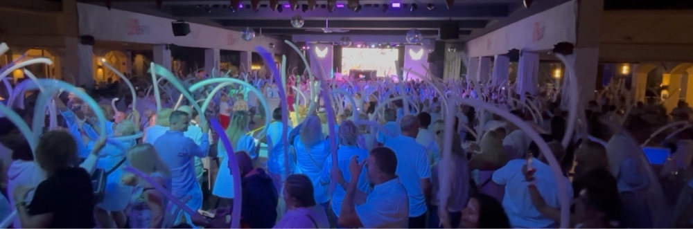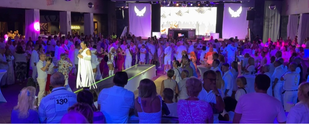 | Every second Friday, the RIU Karamboa has a ‘white party’. Everyone is expected to wear white, and the gift shop can help, if you left home without a white outfit. It was quite funny, people in their 50s and 60s (the vast majority of guests are in that age demographic) whoopin’ it up, dancing and doing a konga line, as if reliving their late teens. |