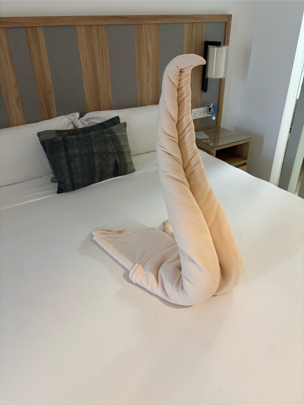| The blanket in our room was turned into a swan by the housekeeper. |