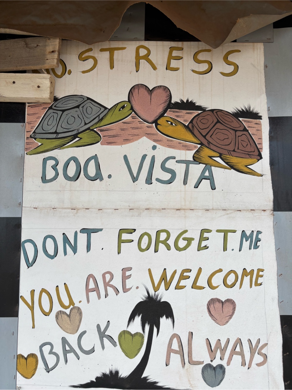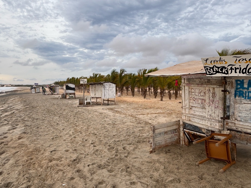 | To both the left and right of the hotel property one finds eight shacks, selling souvenirs. Below, you will see the shacks to the right of the hotel, once of which was sporting the sign above. (The word “no”, as in “no stress”, seems to be blocked.) |