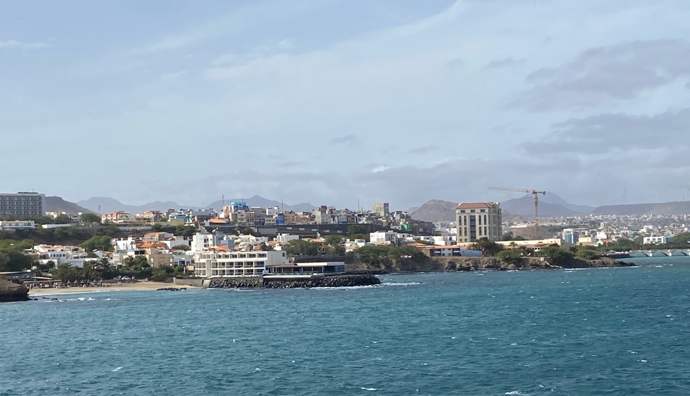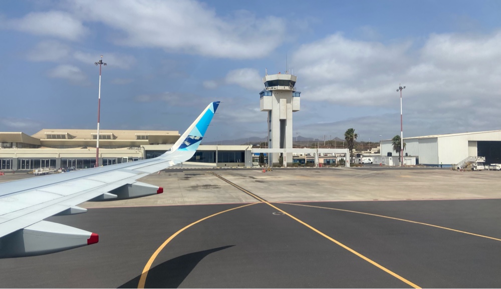 After Pam’s full teaching day, we headed out the door at 4:10PM via Uber to the bus terminal, from where we caught the Halifax Transit express bus to the airport. A freezing rain storm had wrecked havoc across parts of Ontario and Quebec, as well as throughout New Brunswick and PEI. Fortunately, both Halifax and Toronto were narrowly spared from that storm. However, the impacts of those weather systems did result in many cancellations at Halifax Airport. Luckily, our Porter Airlines flight was spared. We did encounter an hour-long delay in departing, though, and already having a narrow connection window in Toronto, things were right down to the wire, connection-wise. When we were pulling up to our gate in Toronto, Azores Airlines texted us to say we had missed the cutoff to check-in. We pleaded (via text) and they agreed to hold our seats. It was touch and go for awhile there! We did make the packed flight, in the end, and we thoroughly enjoyed our business class seats on the overnight flight (5.5 hours). It was a quick connection in Ponta Delgada, Azores, and we were off on a 3.5 hour flight straight south to Praia, the capital of Cabo Verde. We landed there 20 minutes early.