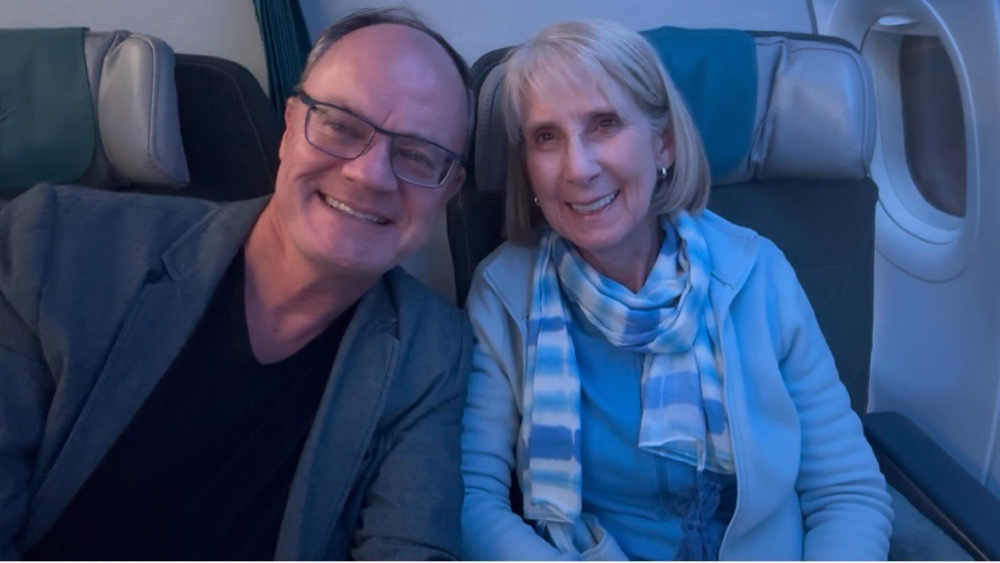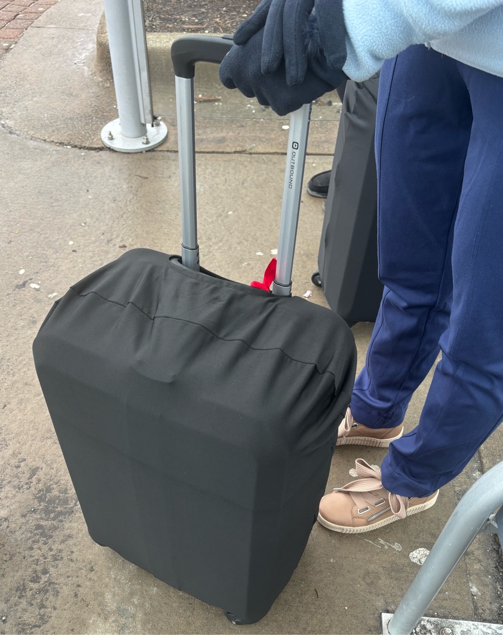 Our new carry-on covers are being christened on this trip. They do a great job of protecting a suitcase. These came with a large opening on each side, to accommodate side handles on the case. As our cases don’t have side handles, the openings would have simply been an opportunity for the covers to be snagged in transit. So our good friend, Juliet, sewed up the openings for us at the last minute. Greatly appreciated, Juliet!