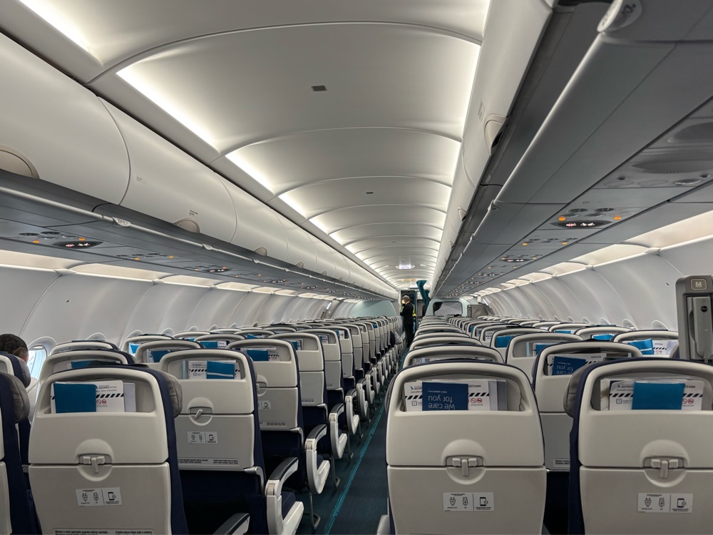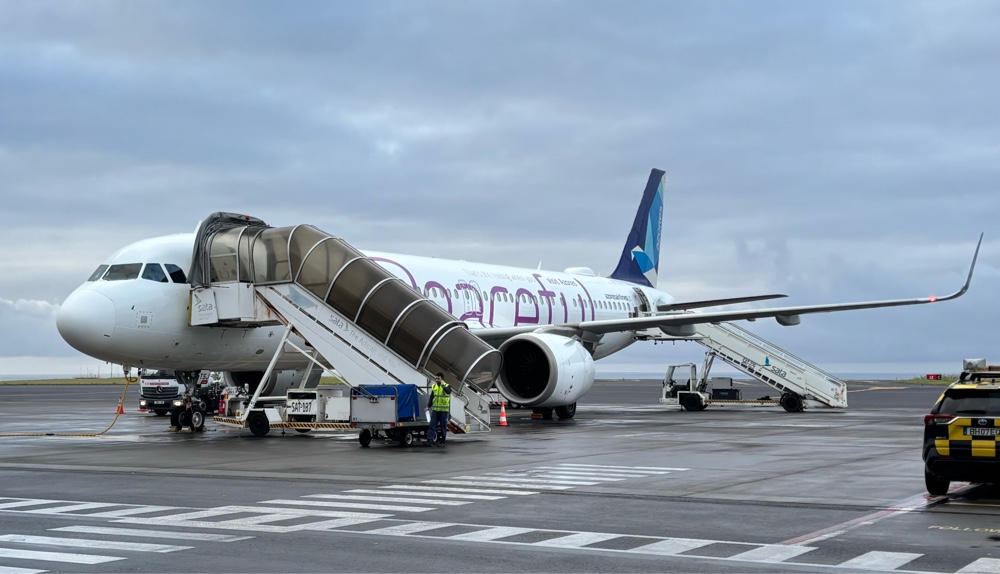 It was a quick turnaround in Ponta Delgada. Equipped with much-needed lattes for the early morning flight, here is Pam walking towards the Airbus A-321neo marked with the word “wonder”.