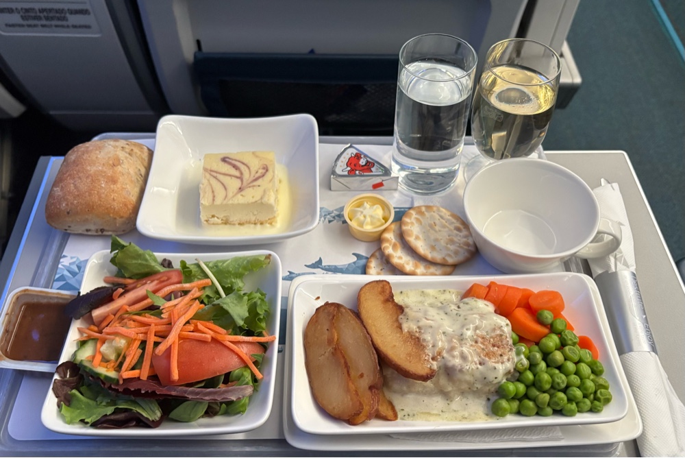 Azores Airlines has actually stopped serving meals in Economy Class on its trans-Atlantic flights. But, in Business Class, we were offered a midnight meal of tilapia, which was quite delicious.