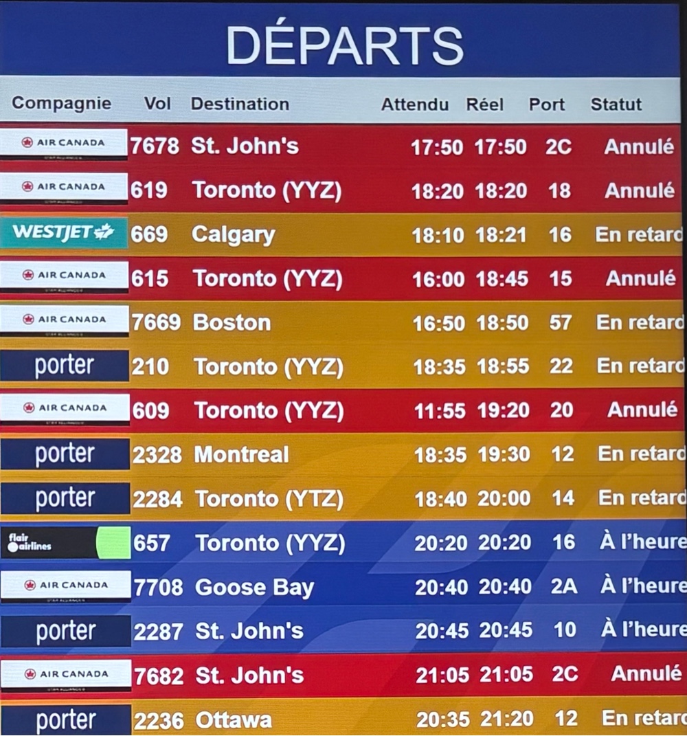The departures screen at Halifax International when we arrived there. We were so fortunate that our flight was not among the many cancellations.