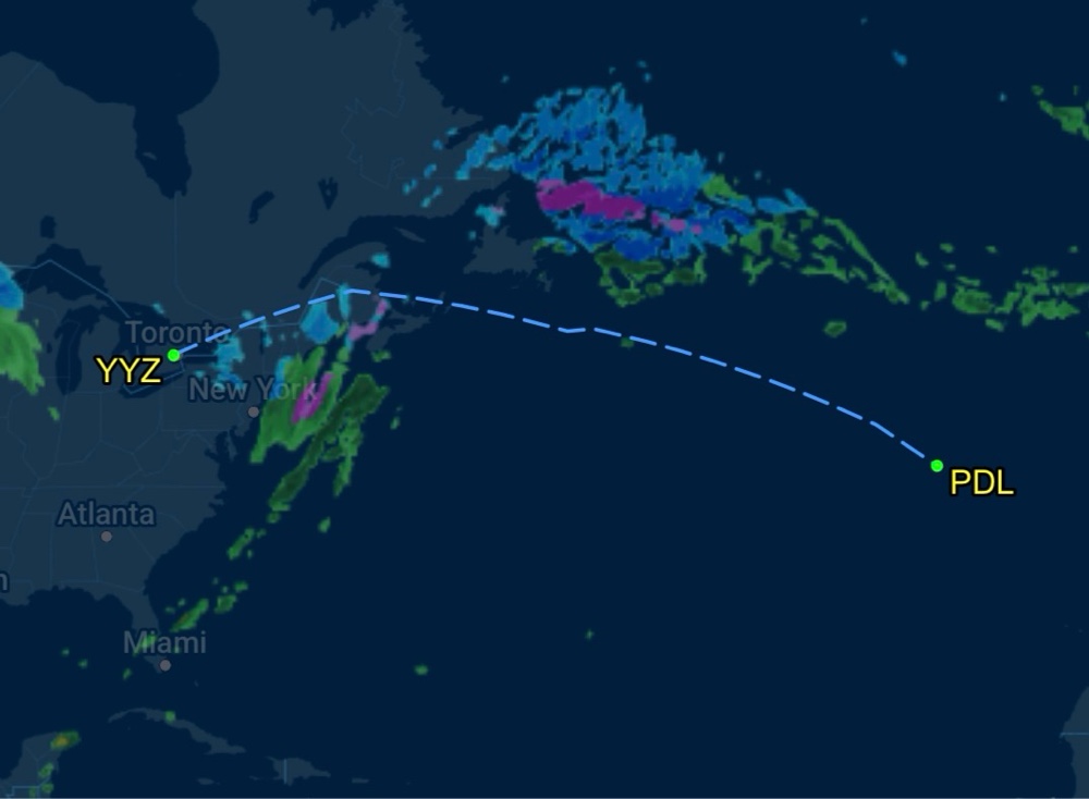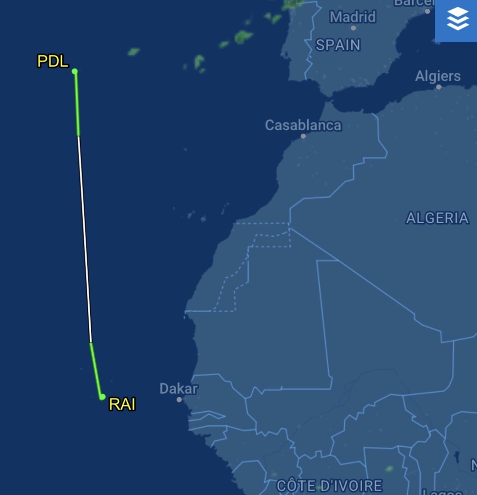 The Azores Airlines flight from Ponta Delgada was a 3.5 hour jaunt straight south to Cabo Verde.