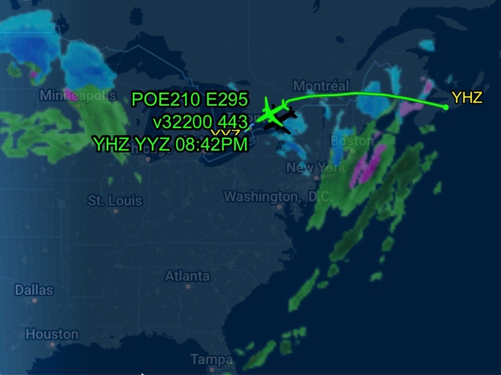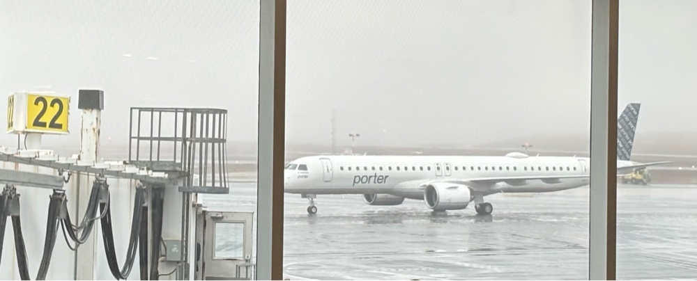 Our Porter Airlines Embraer 195 pulling into the gate. It was 30 minutes late getting in from its Orlando-Halifax run.